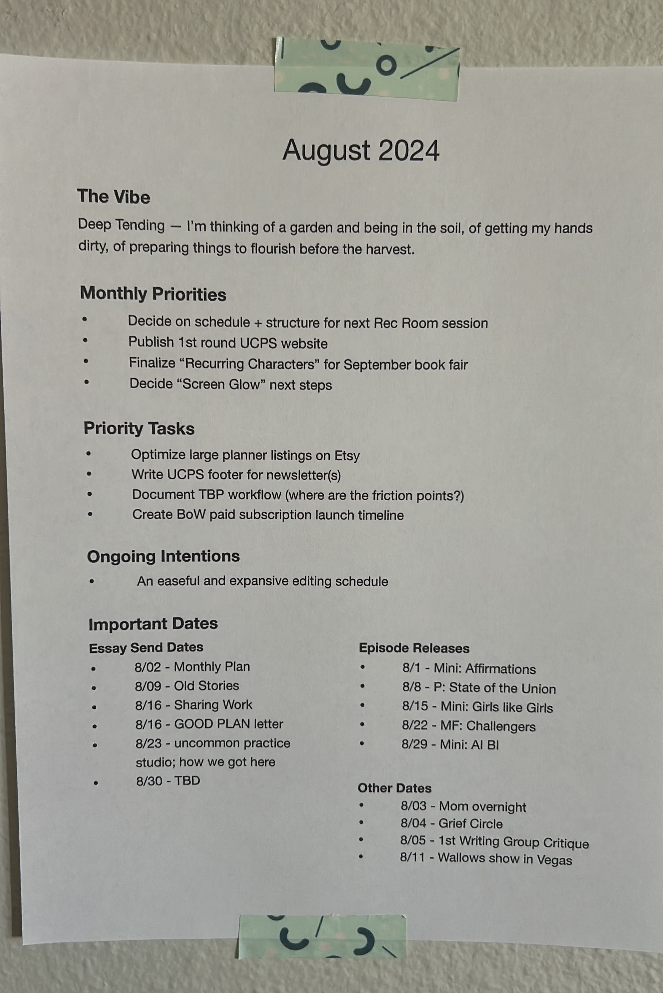 My intention is to put an overview out at the beginning of every month, and for future months to include a recap of the prior month (so in September, I’ll report back on how August went before I give you the September overview). My fantasy is that eventually this space will also include financial breakdowns with information on what money is coming from where1.